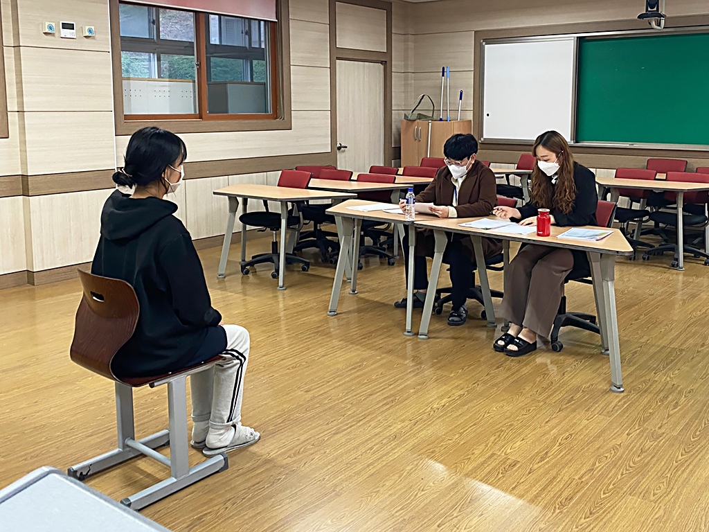면접의 과정에서 면접관들이 중요하게 평가하는 각각의 평가지표를 알아보고 이에 대해 대비할 수 있는 구체적인 방법을 제시합니다. 자기소개서와 학교생활기록부를 토대로 면접문항을 구성하고 실제 면접 상황과 동일한 실습으로 2명의 면접관들이 1명의 학생 면접을 실시하고 학생의 답변 내용과 태도 등에 대해 피드백하는 시간입니다.