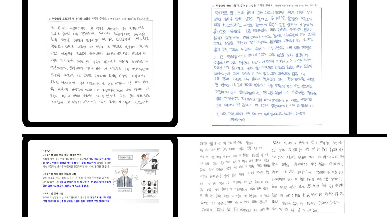 | 2 | 초기 개별상담 | - 학생의 학습환경 및 고민 등을 파악하고 래포 형성하기 - 학생의 성장의지를 파악하고 필요한 도움 확인하기 | 1인당 25 ~ 50분 |